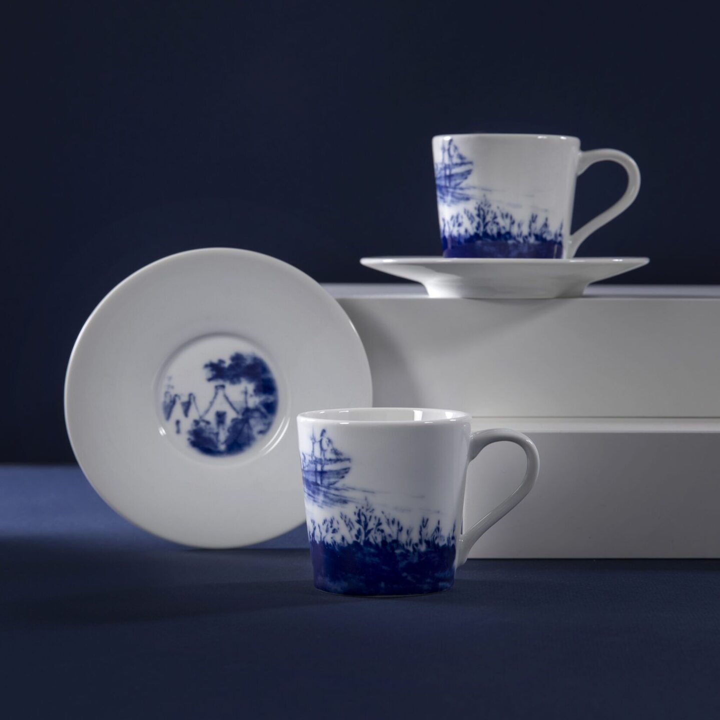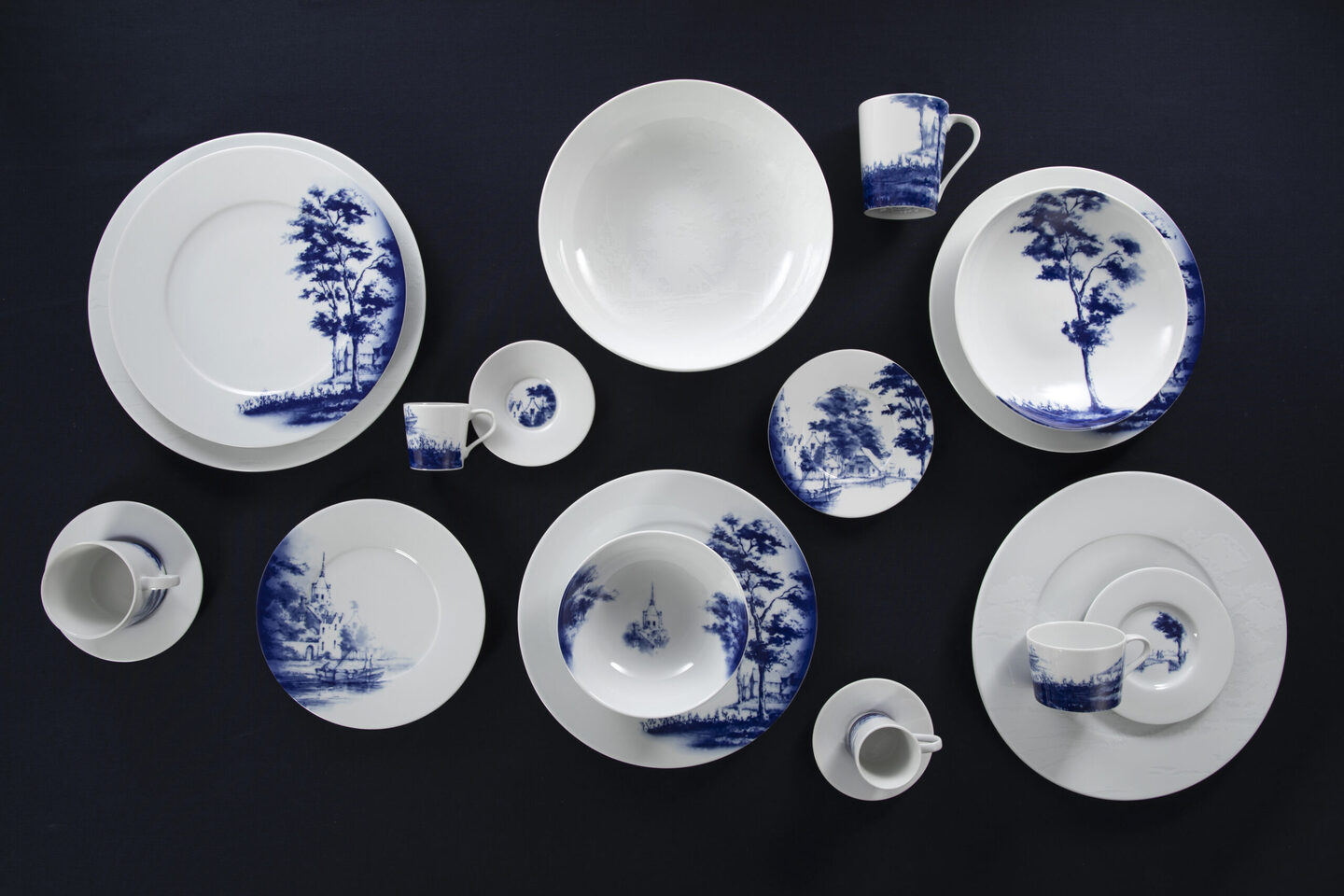 Het 10-delige servies Dutch Dawn vormt in zijn geheel een prachtig Delfts Blauw kunstwerk. Ieder item geeft zijn eigen unieke stukje van het landschap weer. Waar op het dinerbord en het pastabord de natuur centraal staat, is op het dessert bord het stadse gedeelte van de landschapsschildering te zien en wordt de mok omarmd door de douw in het graslandschap. Het wegvagen van het landschap geeft ruimte aan de creativiteit van de chef, in combinatie met de ton-sur-ton decoratie op het onderbord en de grote schaal, benadrukt de mystiek rondom de Hollandse ochtenden.