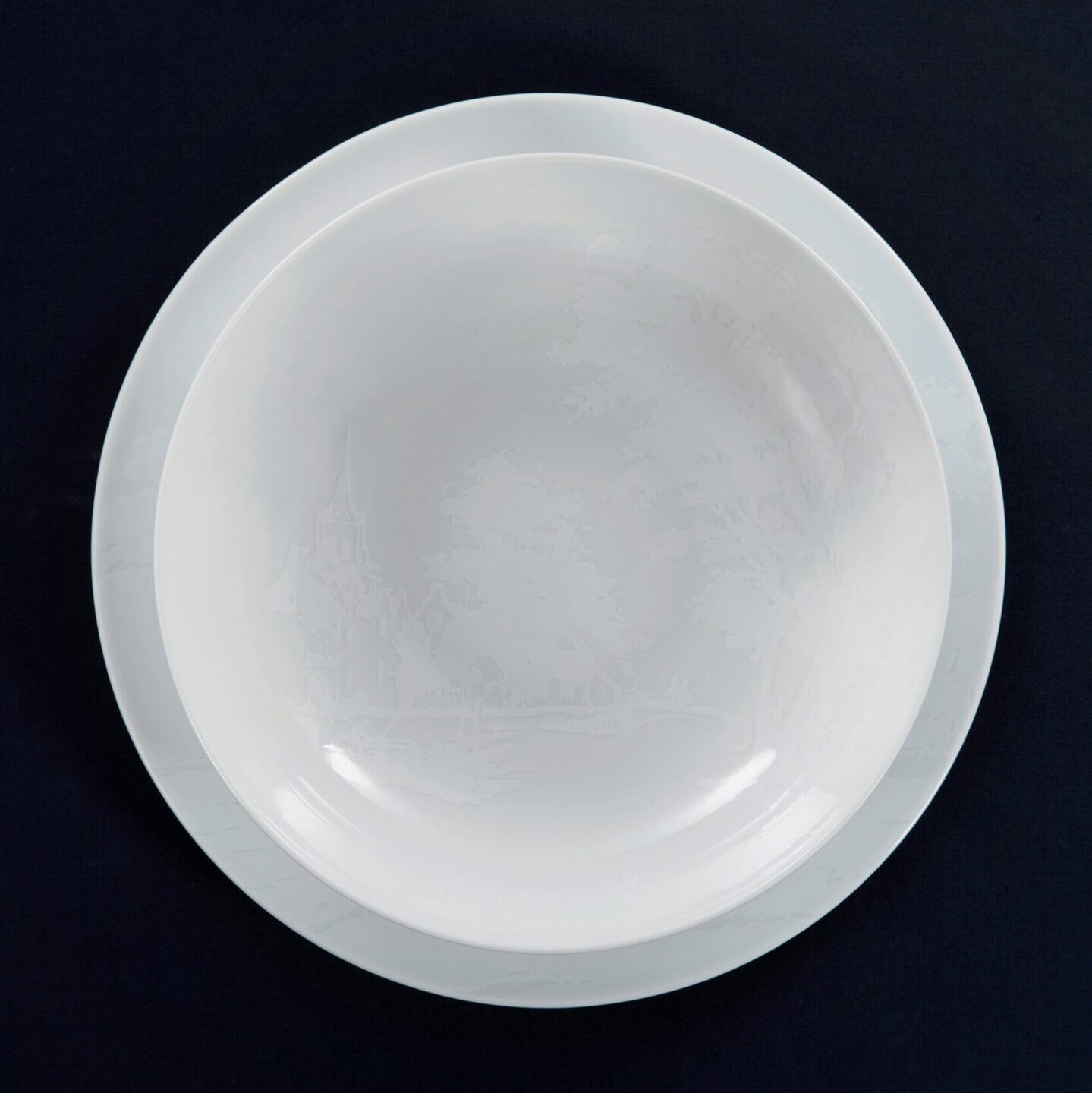 Het 10-delige servies Dutch Dawn vormt in zijn geheel een prachtig Delfts Blauw kunstwerk. Ieder item geeft zijn eigen unieke stukje van het landschap weer. Waar op het dinerbord en het pastabord de natuur centraal staat, is op het dessert bord het stadse gedeelte van de landschapsschildering te zien en wordt de mok omarmd door de douw in het graslandschap. Het wegvagen van het landschap geeft ruimte aan de creativiteit van de chef, in combinatie met de ton-sur-ton decoratie op het onderbord en de grote schaal, benadrukt de mystiek rondom de Hollandse ochtenden.