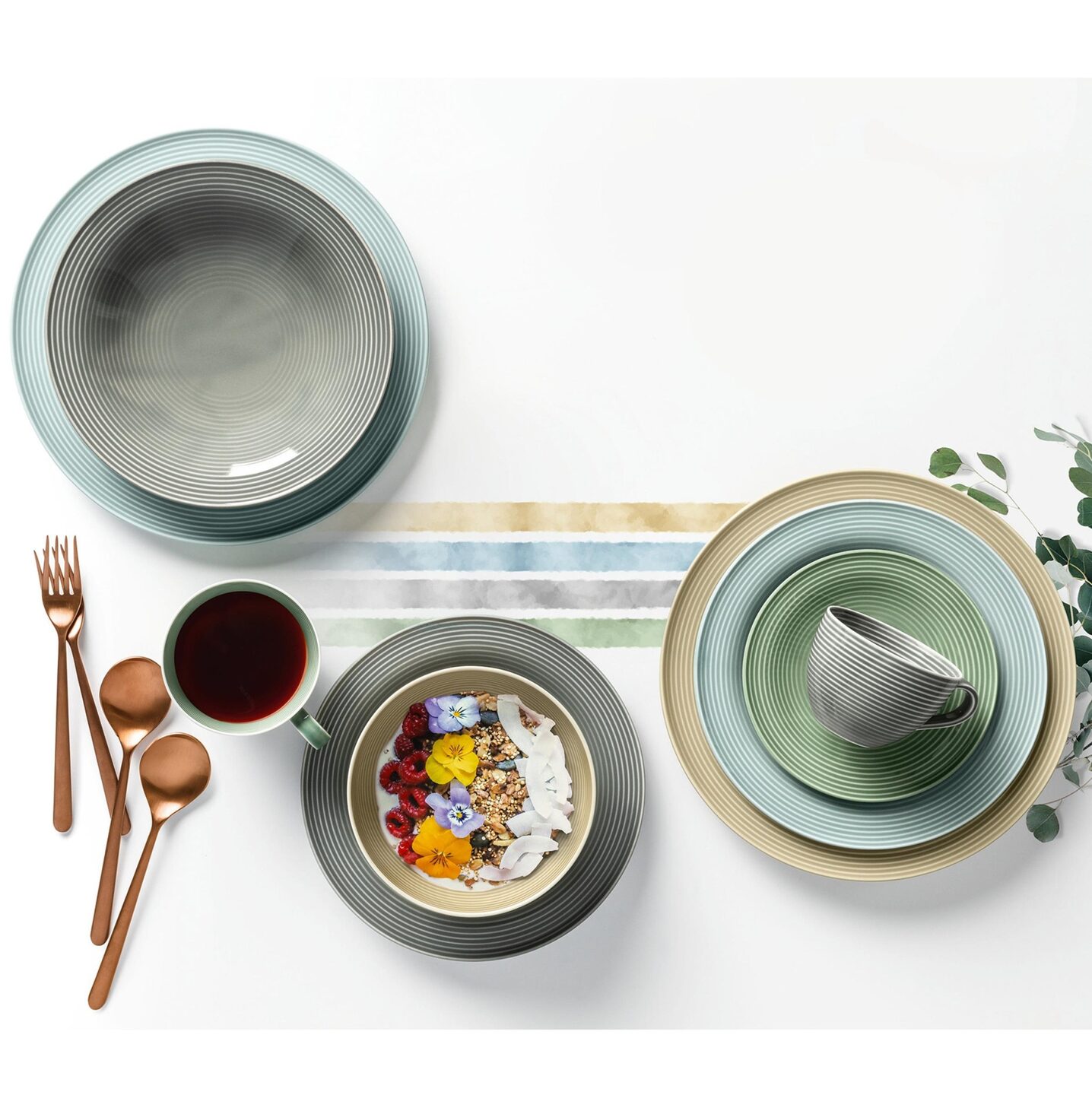 Dit moderne en trendy servies uit de Seltmann collectie geeft uw gedekte tafel een frisse uitstraling. Met zijn trendy kleuren in het wit, zandkleur, blauw, groen en parelgrijs past dit servies in elk huis. Het servies is zowel magnetron-, vaatwasmachine- als ovenbestendig (tot 200 graden). Door de verschillende kleuren in het servies is het ideaal met elkaar te combineren en is het altijd op elkaar afgestemd. Het servies is geïnspireerd op oude Vinylplaten wat is terug te zien in het reliëf in de borden en de daarbij passende naam 'Beat'.