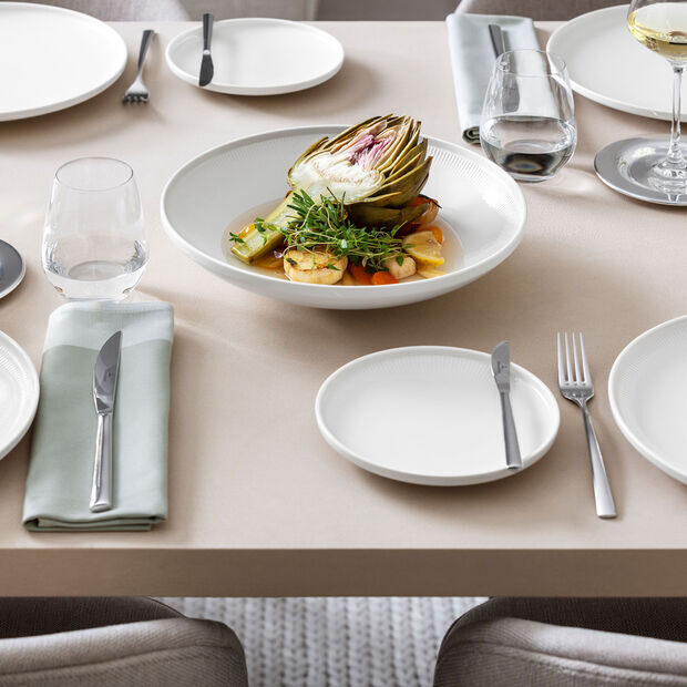 Villeroy & Boch Afina Ontdek de tijdloze elegantie van het Villeroy & Boch Afina servies. Met het ringvormig reliëf en verfijnde details, uitgevoerd in een moderne coupe-vorm. Gemaakt van het roomkleurige Premium Porcelain voegt Afina een eigentijdse flair toe aan elke tafelsetting. Ontworpen door designer Christian Haas en Geproduceerd in Duitsland, biedt dit servies een complete assortiment voor elke gelegenheid, van dagelijkse diners tot speciale feesten. Dankzij de vaatwasser- en magnetronbestendigheid is het Villeroy & Boch Afina servies niet alleen elegant, maar ook praktisch in gebruik. Laat je tafel stralen met de verfijnde charme van het Afina servies.